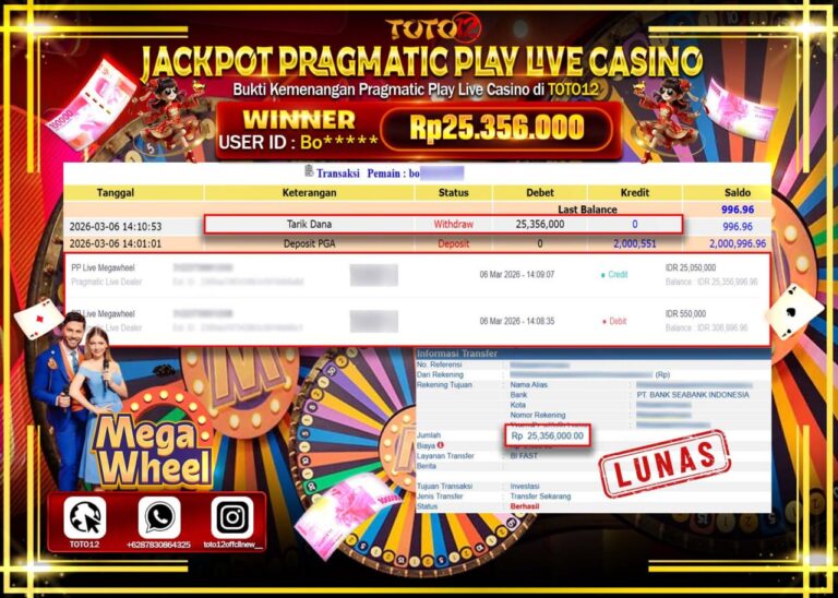 Selamat kepada Member Kami Bo****** Telah Jackpot dan berhasil mendapatkan kemenangan besar pada permainan JACKPOT PRAGMATIC PLAY LIVE GAME CASINO (PP LIVE MEGAWHEEL) Dengan Kemenangan Sebesar Rp.25.356.000–. Setelah mengisi Fomulir Withdraw dengan Kurang waktu 1-2 Menit Dana sudah kami Trasnfer kepada Pemilik Userid dan dana sudah dapat di cairkan oleh pemenang. Bukti Pembayaran yang TOTO12 berikan…