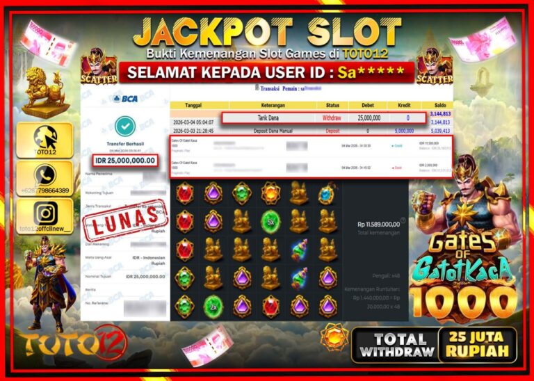 Selamat kepada Member Kami Sa**** Telah Jackpot dan berhasil mendapatkan kemenangan besar pada permainan JACKPOT SLOT GAME (GATES OF GATOTKACA 1000) Dengan Kemenangan Sebesar Rp.25.000.000–. Setelah mengisi Fomulir Withdraw dengan Kurang waktu 1-2 Menit Dana sudah kami Trasnfer kepada Pemilik Userid dan dana sudah dapat di cairkan oleh pemenang. Bukti Pembayaran yang TOTO12 berikan merupakan Bukti…