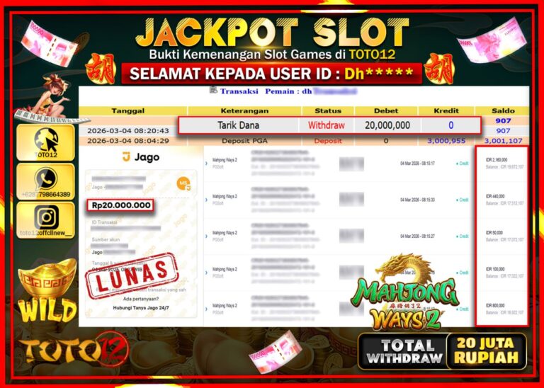 Selamat kepada Member Kami Dh**** Telah Jackpot dan berhasil mendapatkan kemenangan besar pada permainan JACKPOT SLOT GAME (MAHJONG WAYS 2) Dengan Kemenangan Sebesar Rp.20.000.000–. Setelah mengisi Fomulir Withdraw dengan Kurang waktu 1-2 Menit Dana sudah kami Trasnfer kepada Pemilik Userid dan dana sudah dapat di cairkan oleh pemenang. Bukti Pembayaran yang TOTO12 berikan merupakan Bukti Pembayaran…
