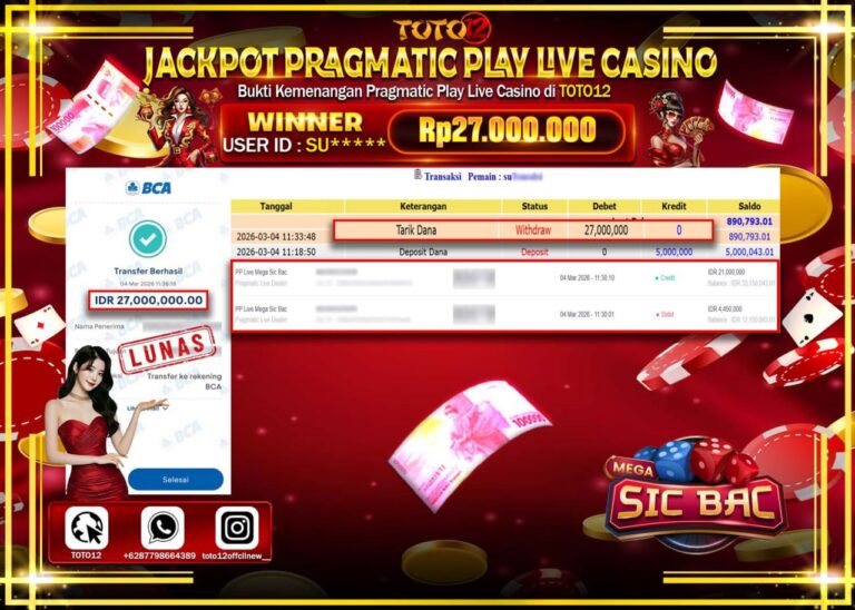 Selamat kepada Member Kami SU****** Telah Jackpot dan berhasil mendapatkan kemenangan besar pada permainan JACKPOT PRAGMATIC PLAY LIVE GAME CASINO (PP LIVE MEGA SIC BAC) Dengan Kemenangan Sebesar Rp.27.000.000–. Setelah mengisi Fomulir Withdraw dengan Kurang waktu 1-2 Menit Dana sudah kami Trasnfer kepada Pemilik Userid dan dana sudah dapat di cairkan oleh pemenang. Bukti Pembayaran yang…