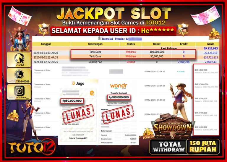 Selamat kepada Member Kami He**** Telah Jackpot dan berhasil mendapatkan kemenangan besar pada permainan JACKPOT SLOT GAME (WILD BOUNTY SHOWDOWN) Dengan Kemenangan Sebesar Rp.150.000.000–. Setelah mengisi Fomulir Withdraw dengan Kurang waktu 1-2 Menit Dana sudah kami Trasnfer kepada Pemilik Userid dan dana sudah dapat di cairkan oleh pemenang. Bukti Pembayaran yang TOTO12 berikan merupakan Bukti Pembayaran…