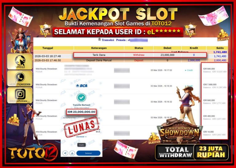 Selamat kepada Member Kami eL**** Telah Jackpot dan berhasil mendapatkan kemenangan besar pada permainan JACKPOT SLOT GAME (WILD BOUNTY SHOWDOWN) Dengan Kemenangan Sebesar Rp.23.000.000–. Setelah mengisi Fomulir Withdraw dengan Kurang waktu 1-2 Menit Dana sudah kami Trasnfer kepada Pemilik Userid dan dana sudah dapat di cairkan oleh pemenang. Bukti Pembayaran yang TOTO12 berikan merupakan Bukti Pembayaran…