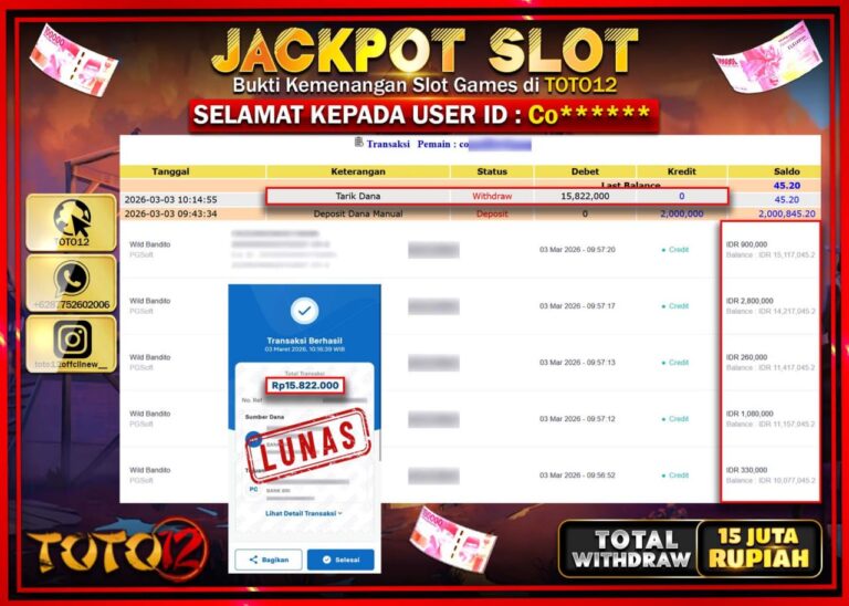 Selamat kepada Member Kami Co**** Telah Jackpot dan berhasil mendapatkan kemenangan besar pada permainan JACKPOT SLOT GAME (WILD BANDITO SHOWDOWND) Dengan Kemenangan Sebesar Rp.15.822.000–. Setelah mengisi Fomulir Withdraw dengan Kurang waktu 1-2 Menit Dana sudah kami Trasnfer kepada Pemilik Userid dan dana sudah dapat di cairkan oleh pemenang. Bukti Pembayaran yang TOTO12 berikan merupakan Bukti Pembayaran…