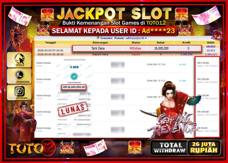 Selamat kepada Member Kami Ad****23 Telah Jackpot dan berhasil mendapatkan kemenangan besar pada permainan JACKPOT SLOT GAME (GEISHA REVENGE) Dengan Kemenangan Sebesar Rp.26.000.000–. Setelah mengisi Fomulir Withdraw dengan Kurang waktu 1-2 Menit Dana sudah kami Trasnfer kepada Pemilik Userid dan dana sudah dapat di cairkan oleh pemenang. Bukti Pembayaran yang TOTO12 berikan merupakan Bukti Pembayaran yang SAH…