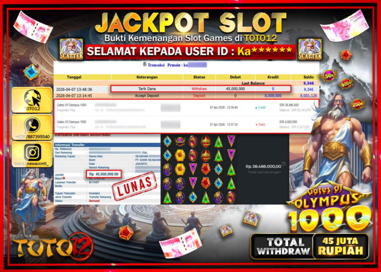 Selamat kepada Member Kami Ka***** Telah Jackpot dan berhasil mendapatkan kemenangan besar pada permainan JACKPOT SLOT GAME (GATES OF OLYMPUS 1000) Dengan Kemenangan Sebesar Rp.45.000.000–. Setelah mengisi Fomulir Withdraw dengan Kurang waktu 1-2 Menit Dana sudah kami Trasnfer kepada Pemilik Userid dan dana sudah dapat di cairkan oleh pemenang. Bukti Pembayaran yang TOTO12 berikan merupakan Bukti…