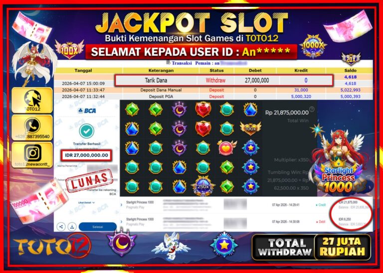 Selamat kepada Member Kami An***** Telah Jackpot dan berhasil mendapatkan kemenangan besar pada permainan JACKPOT SLOT GAME (STARLIGHT PRINCESS 1000) Dengan Kemenangan Sebesar Rp.27.000.000–. Setelah mengisi Fomulir Withdraw dengan Kurang waktu 1-2 Menit Dana sudah kami Trasnfer kepada Pemilik Userid dan dana sudah dapat di cairkan oleh pemenang. Bukti Pembayaran yang TOTO12 berikan merupakan Bukti Pembayaran…