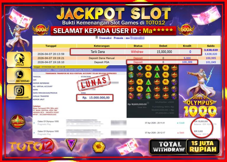 Selamat kepada Member Kami Ma***** Telah Jackpot dan berhasil mendapatkan kemenangan besar pada permainan JACKPOT SLOT GAME (GATES OF OLYMPUS 1000) Dengan Kemenangan Sebesar Rp.15.000.000–. Setelah mengisi Fomulir Withdraw dengan Kurang waktu 1-2 Menit Dana sudah kami Trasnfer kepada Pemilik Userid dan dana sudah dapat di cairkan oleh pemenang. Bukti Pembayaran yang TOTO12 berikan merupakan Bukti…
