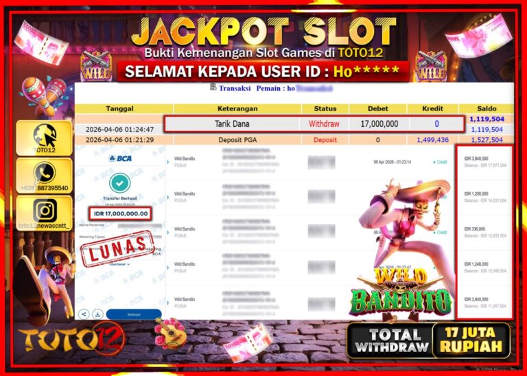 Selamat kepada Member Kami Ho***** Telah Jackpot dan berhasil mendapatkan kemenangan besar pada permainan JACKPOT SLOT GAME (WILD BANDITO) Dengan Kemenangan Sebesar Rp.17.000.000–. Setelah mengisi Fomulir Withdraw dengan Kurang waktu 1-2 Menit Dana sudah kami Trasnfer kepada Pemilik Userid dan dana sudah dapat di cairkan oleh pemenang. Bukti Pembayaran yang TOTO12 berikan merupakan Bukti Pembayaran yang SAH…