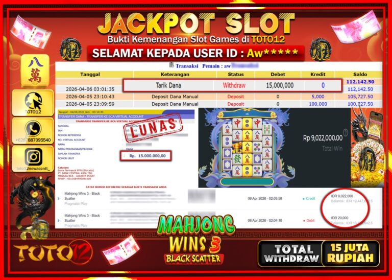 Selamat kepada Member Kami Aw***** Telah Jackpot dan berhasil mendapatkan kemenangan besar pada permainan JACKPOT SLOT GAME (MAHJONG WINS 3 BLACK SCATTER) Dengan Kemenangan Sebesar Rp.15.000.000–. Setelah mengisi Fomulir Withdraw dengan Kurang waktu 1-2 Menit Dana sudah kami Trasnfer kepada Pemilik Userid dan dana sudah dapat di cairkan oleh pemenang. Bukti Pembayaran yang TOTO12 berikan merupakan…