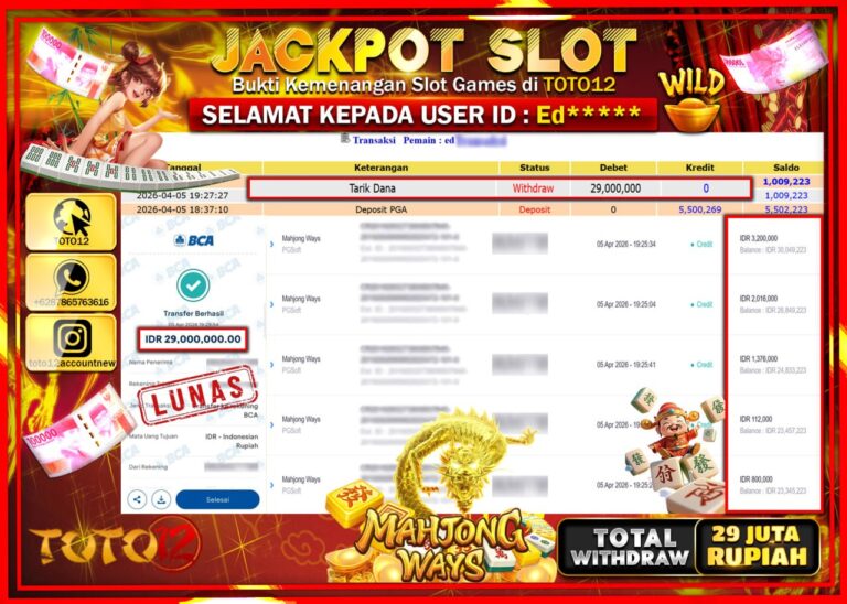 Selamat kepada Member Kami Ed***** Telah Jackpot dan berhasil mendapatkan kemenangan besar pada permainan JACKPOT SLOT GAME (MAHJONG WAYS) Dengan Kemenangan Sebesar Rp.29.000.000–. Setelah mengisi Fomulir Withdraw dengan Kurang waktu 1-2 Menit Dana sudah kami Trasnfer kepada Pemilik Userid dan dana sudah dapat di cairkan oleh pemenang. Bukti Pembayaran yang TOTO12 berikan merupakan Bukti Pembayaran yang SAH…