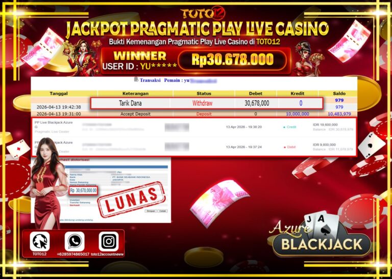 Selamat kepada Member Kami Yu****** Telah Jackpot dan berhasil mendapatkan kemenangan besar pada permainan JACKPOT PRAGMATIC PLAY LIVE GAME CASINO (PP LIVE BLACKJACK AZURE) Dengan Kemenangan Sebesar Rp.30.678.000–. Setelah mengisi Fomulir Withdraw dengan Kurang waktu 1-2 Menit Dana sudah kami Trasnfer kepada Pemilik Userid dan dana sudah dapat di cairkan oleh pemenang. Bukti Pembayaran yang TOTO12…