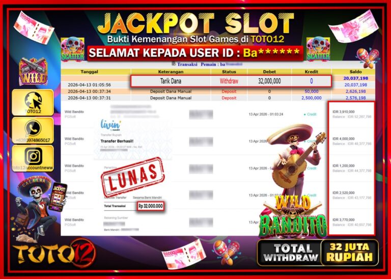 Selamat kepada Member Kami Ba***** Telah Jackpot dan berhasil mendapatkan kemenangan besar pada permainan JACKPOT SLOT GAME (WILD BANDITO) Dengan Kemenangan Sebesar Rp.32.000.000–. Setelah mengisi Fomulir Withdraw dengan Kurang waktu 1-2 Menit Dana sudah kami Trasnfer kepada Pemilik Userid dan dana sudah dapat di cairkan oleh pemenang. Bukti Pembayaran yang TOTO12 berikan merupakan Bukti Pembayaran yang SAH…