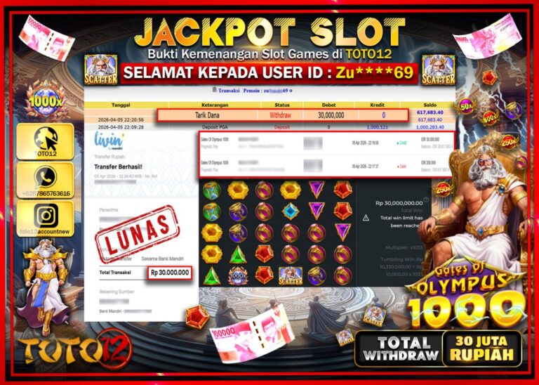 Selamat kepada Member Kami Zu*****69 Telah Jackpot dan berhasil mendapatkan kemenangan besar pada permainan JACKPOT SLOT GAME (GATES OF OLYMPUS 1000) Dengan Kemenangan Sebesar Rp.30.000.000–. Setelah mengisi Fomulir Withdraw dengan Kurang waktu 1-2 Menit Dana sudah kami Trasnfer kepada Pemilik Userid dan dana sudah dapat di cairkan oleh pemenang. Bukti Pembayaran yang TOTO12 berikan merupakan Bukti…