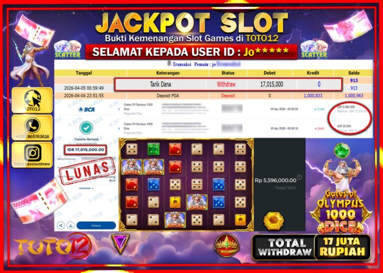 HANYA DI TOTO12 JP PASTI DI BAYAR LUNAS DAN CEPAT!!!!!! JACKPOT SLOT GAME (GATES OF OLYMPUS 1000 DICE) Rp.17.015.000!!!!