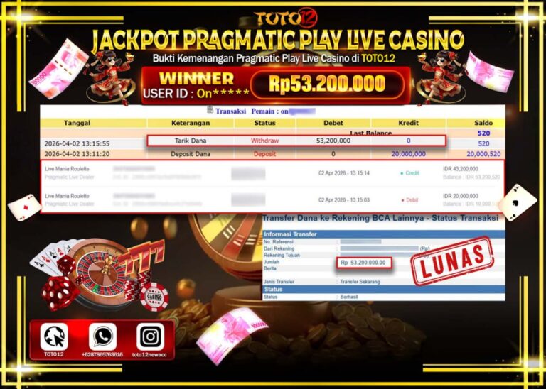 Selamat kepada Member Kami On****** Telah Jackpot dan berhasil mendapatkan kemenangan besar pada permainan JACKPOT PRAGMATIC PLAY LIVE GAME CASINO (LIVE MANIA ROULETTE) Dengan Kemenangan Sebesar Rp.53.200.000–. Setelah mengisi Fomulir Withdraw dengan Kurang waktu 1-2 Menit Dana sudah kami Trasnfer kepada Pemilik Userid dan dana sudah dapat di cairkan oleh pemenang. Bukti Pembayaran yang TOTO12 berikan…