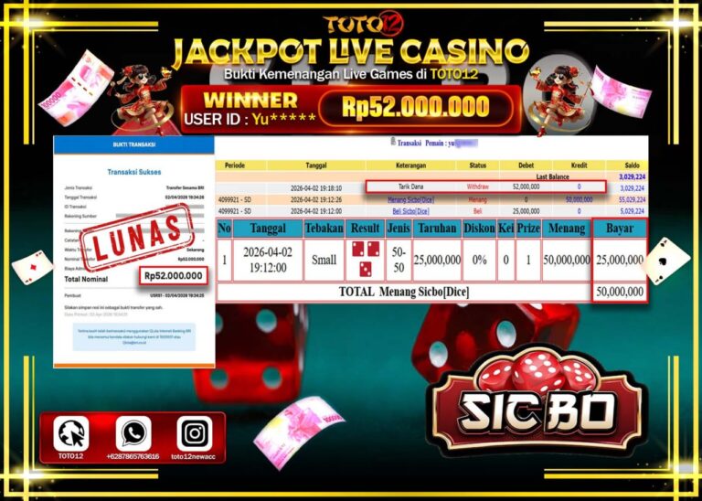 Selamat kepada Member Kami Yu**** Telah Jackpot dan berhasil mendapatkan kemenangan besar pada permainan JACKPOT LIVE GAMES CASINO (SICBO DICE) Dengan Kemenangan Sebesar Rp.52.000.000–. Setelah mengisi Fomulir Withdraw dengan Kurang waktu 1-2 Menit Dana sudah kami Trasnfer kepada Pemilik Userid dan dana sudah dapat di cairkan oleh pemenang. Bukti Pembayaran yang TOTO12 berikan merupakan Bukti Pembayaran…