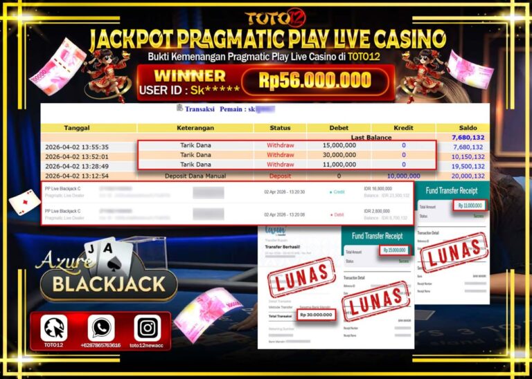 Selamat kepada Member Kami Sk****** Telah Jackpot dan berhasil mendapatkan kemenangan besar pada permainan JACKPOT PRAGMATIC PLAY LIVE GAME CASINO (PP LIVE BLACKJACK C) Dengan Kemenangan Sebesar Rp.56.000.000–. Setelah mengisi Fomulir Withdraw dengan Kurang waktu 1-2 Menit Dana sudah kami Trasnfer kepada Pemilik Userid dan dana sudah dapat di cairkan oleh pemenang. Bukti Pembayaran yang TOTO12…