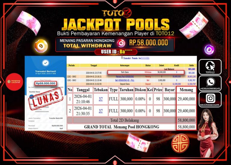 Selamat kepada Member Kami Ba****** Telah Jackpot dan berhasil mendapatkan kemenangan besar pada permainan JACKPOT POOLS PASARAN ( HONGKONG ) Dengan Kemenangan Sebesar Rp.58.000.000–. Setelah mengisi Fomulir Withdraw dengan Kurang waktu 1-2 Menit Dana sudah kami Trasnfer kepada Pemilik Userid dan dana sudah dapat di cairkan oleh pemenang. Bukti Pembayaran yang TOTO12 berikan merupakan Bukti Pembayaran…