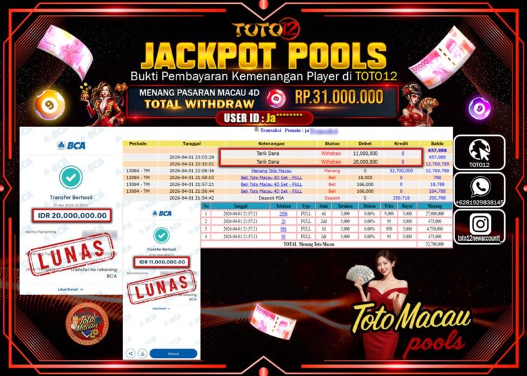Selamat kepada Member Kami Ja****** Telah Jackpot dan berhasil mendapatkan kemenangan besar pada permainan JACKPOT POOLS PASARAN (MACAU 4D) Dengan Kemenangan Sebesar Rp.31.000.000–. Setelah mengisi Fomulir Withdraw dengan Kurang waktu 1-2 Menit Dana sudah kami Trasnfer kepada Pemilik Userid dan dana sudah dapat di cairkan oleh pemenang. Bukti Pembayaran yang TOTO12 berikan merupakan Bukti Pembayaran yang SAH…