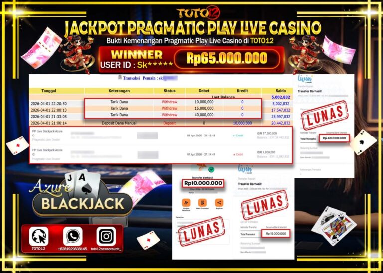 Selamat kepada Member Kami On****** Telah Jackpot dan berhasil mendapatkan kemenangan besar pada permainan JACKPOT PRAGMATIC PLAY LIVE GAME CASINO (LIVE MANIA ROULETTE) Dengan Kemenangan Sebesar Rp.40.100.000–. Setelah mengisi Fomulir Withdraw dengan Kurang waktu 1-2 Menit Dana sudah kami Trasnfer kepada Pemilik Userid dan dana sudah dapat di cairkan oleh pemenang. Bukti Pembayaran yang TOTO12 berikan…