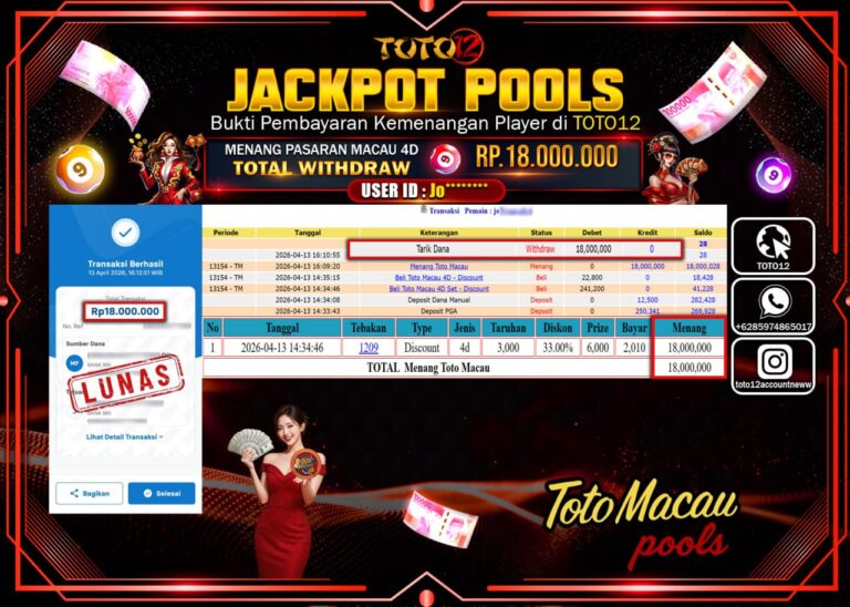 Selamat kepada Member Kami Jo****** Telah Jackpot dan berhasil mendapatkan kemenangan besar pada permainan JACKPOT POOLS PASARAN (MACAU 4D) Dengan Kemenangan Sebesar Rp.18.000.000–. Setelah mengisi Fomulir Withdraw dengan Kurang waktu 1-2 Menit Dana sudah kami Trasnfer kepada Pemilik Userid dan dana sudah dapat di cairkan oleh pemenang. Bukti Pembayaran yang TOTO12 berikan merupakan Bukti Pembayaran yang SAH…