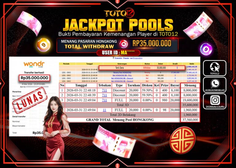 Selamat kepada Member Kami MA****** Telah Jackpot dan berhasil mendapatkan kemenangan besar pada permainan JACKPOT POOLS PASARAN ( HONGKONG ) Dengan Kemenangan Sebesar Rp.35.000.000–. Setelah mengisi Fomulir Withdraw dengan Kurang waktu 1-2 Menit Dana sudah kami Trasnfer kepada Pemilik Userid dan dana sudah dapat di cairkan oleh pemenang. Bukti Pembayaran yang TOTO12 berikan merupakan Bukti Pembayaran…