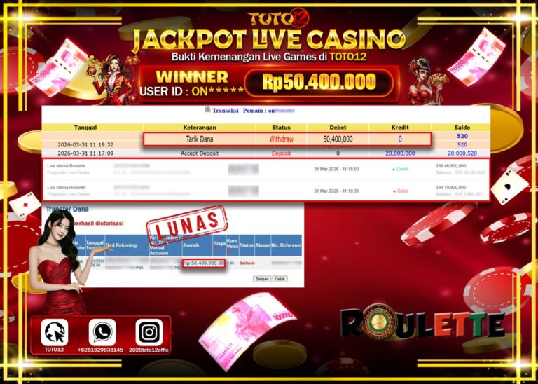 Selamat kepada Member Kami ON**** Telah Jackpot dan berhasil mendapatkan kemenangan besar pada permainan JACKPOT LIVE GAMES CASINO (LIVE MANIA ROULETTE) Dengan Kemenangan Sebesar Rp.50.400.000–. Setelah mengisi Fomulir Withdraw dengan Kurang waktu 1-2 Menit Dana sudah kami Trasnfer kepada Pemilik Userid dan dana sudah dapat di cairkan oleh pemenang. Bukti Pembayaran yang TOTO12 berikan merupakan Bukti…