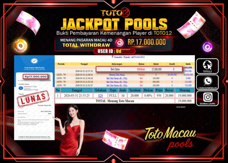 Selamat kepada Member Kami Ud****** Telah Jackpot dan berhasil mendapatkan kemenangan besar pada permainan JACKPOT POOLS PASARAN (MACAU 4D) Dengan Kemenangan Sebesar Rp.17.000.000–. Setelah mengisi Fomulir Withdraw dengan Kurang waktu 1-2 Menit Dana sudah kami Trasnfer kepada Pemilik Userid dan dana sudah dapat di cairkan oleh pemenang. Bukti Pembayaran yang TOTO12 berikan merupakan Bukti Pembayaran yang SAH…