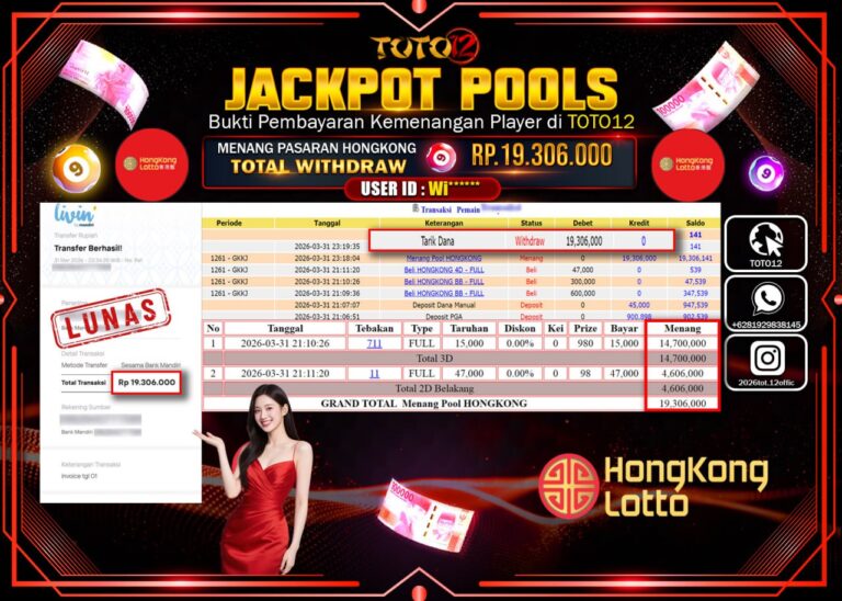 Selamat kepada Member Kami Wi****** Telah Jackpot dan berhasil mendapatkan kemenangan besar pada permainan JACKPOT POOLS PASARAN ( HONGKONG ) Dengan Kemenangan Sebesar Rp.19.306.000–. Setelah mengisi Fomulir Withdraw dengan Kurang waktu 1-2 Menit Dana sudah kami Trasnfer kepada Pemilik Userid dan dana sudah dapat di cairkan oleh pemenang. Bukti Pembayaran yang TOTO12 berikan merupakan Bukti Pembayaran…