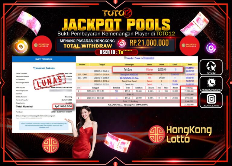Selamat kepada Member Kami To****** Telah Jackpot dan berhasil mendapatkan kemenangan besar pada permainan JACKPOT POOLS PASARAN ( HONGKONG ) Dengan Kemenangan Sebesar Rp.21.000.000–. Setelah mengisi Fomulir Withdraw dengan Kurang waktu 1-2 Menit Dana sudah kami Trasnfer kepada Pemilik Userid dan dana sudah dapat di cairkan oleh pemenang. Bukti Pembayaran yang TOTO12 berikan merupakan Bukti Pembayaran…