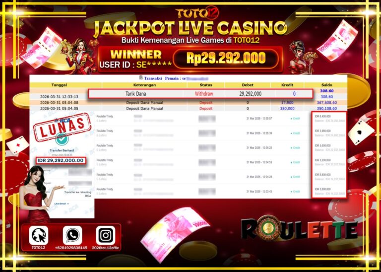 Selamat kepada Member Kami SE**** Telah Jackpot dan berhasil mendapatkan kemenangan besar pada permainan JACKPOT LIVE GAMES CASINO (ROULETTE TRINITY) Dengan Kemenangan Sebesar Rp.29.292.000–. Setelah mengisi Fomulir Withdraw dengan Kurang waktu 1-2 Menit Dana sudah kami Trasnfer kepada Pemilik Userid dan dana sudah dapat di cairkan oleh pemenang. Bukti Pembayaran yang TOTO12 berikan merupakan Bukti Pembayaran…