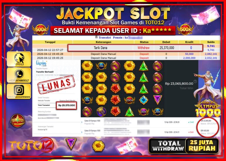 Selamat kepada Member Kami Ka***** Telah Jackpot dan berhasil mendapatkan kemenangan besar pada permainan JACKPOT SLOT GAME (GATES OF OLYMPUS 1000) Dengan Kemenangan Sebesar Rp.25.370.000–. Setelah mengisi Fomulir Withdraw dengan Kurang waktu 1-2 Menit Dana sudah kami Trasnfer kepada Pemilik Userid dan dana sudah dapat di cairkan oleh pemenang. Bukti Pembayaran yang TOTO12 berikan merupakan Bukti…
