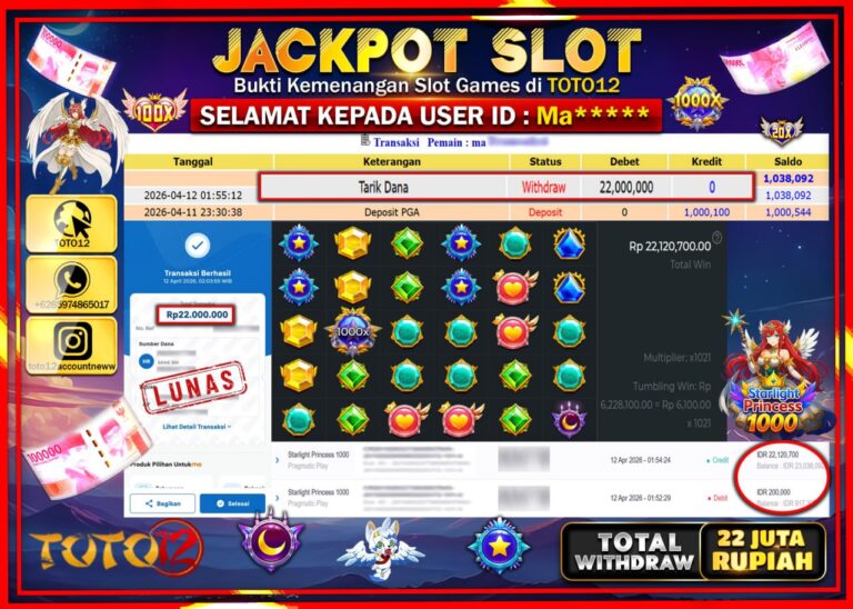 Selamat kepada Member Kami Ma***** Telah Jackpot dan berhasil mendapatkan kemenangan besar pada permainan JACKPOT SLOT GAME (STARLIGHT PRINCESS 1000) Dengan Kemenangan Sebesar Rp.22.000.000–. Setelah mengisi Fomulir Withdraw dengan Kurang waktu 1-2 Menit Dana sudah kami Trasnfer kepada Pemilik Userid dan dana sudah dapat di cairkan oleh pemenang. Bukti Pembayaran yang TOTO12 berikan merupakan Bukti Pembayaran…
