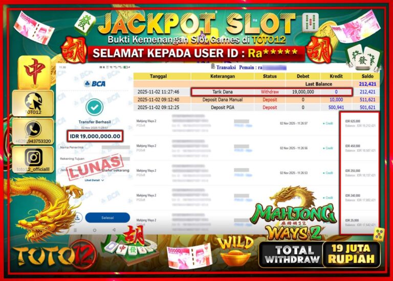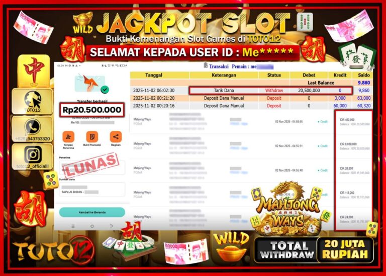 Selamat kepada Member Kami Me****** Telah Jackpot dan berhasil mendapatkan kemenangan besar pada permainan JACKPOT SLOT GAME (MAHJONG WAYS) Dengan Kemenangan Sebesar Rp.20.500.000 –. Setelah mengisi Fomulir Withdraw dengan Kurang waktu 1-2 Menit Dana sudah kami Trasnfer kepada Pemilik Userid dan dana sudah dapat di cairkan oleh pemenang. Bukti Pembayaran yang TOTO12 berikan merupakan Bukti Pembayaran…