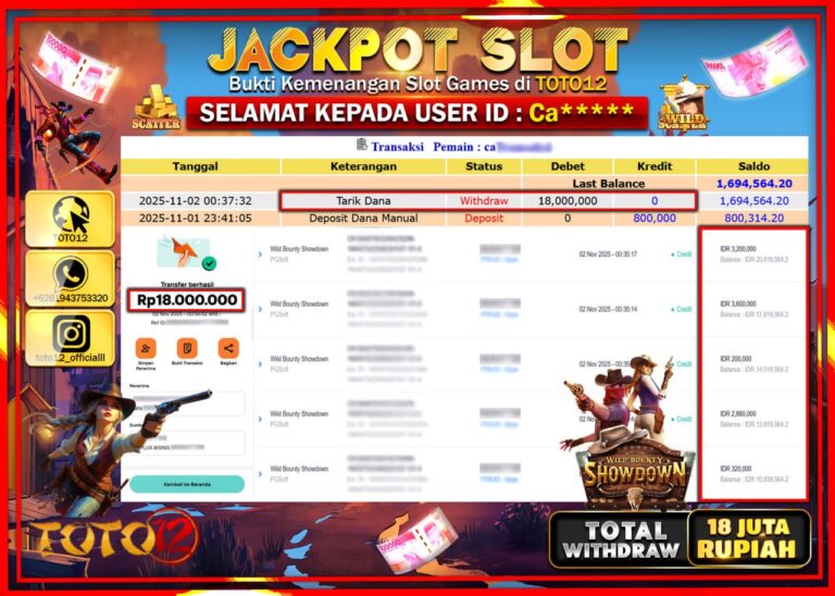Selamat kepada Member Kami Ca****** Telah Jackpot dan berhasil mendapatkan kemenangan besar pada permainan JACKPOT SLOT GAME (WILD BOUNTY SHOWDOWN) Dengan Kemenangan Sebesar Rp.18.000.000 –. Setelah mengisi Fomulir Withdraw dengan Kurang waktu 1-2 Menit Dana sudah kami Trasnfer kepada Pemilik Userid dan dana sudah dapat di cairkan oleh pemenang. Bukti Pembayaran yang TOTO12 berikan merupakan Bukti…