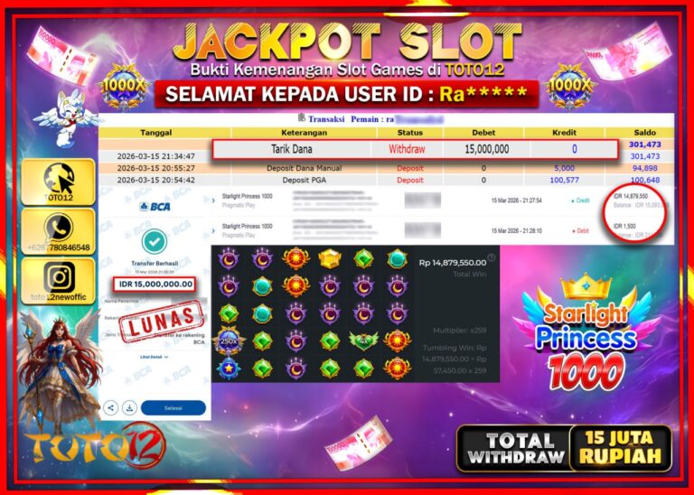 Selamat kepada Member Kami Ra****** Telah Jackpot dan berhasil mendapatkan kemenangan besar pada permainan JACKPOT SLOT GAME (STARLIGHT PRINCESS 1000) Dengan Kemenangan Sebesar Rp.15.000.000. Setelah mengisi Fomulir Withdraw dengan Kurang waktu 1-2 Menit Dana sudah kami Trasnfer kepada Pemilik Userid dan dana sudah dapat di cairkan oleh pemenang. Bukti Pembayaran yang TOTO12 berikan merupakan Bukti Pembayaran…