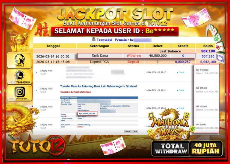 Selamat kepada Member Kami Be****** Telah Jackpot dan berhasil mendapatkan kemenangan besar pada permainan JACKPOT SLOT GAME (MAHJONG WAYS) Dengan Kemenangan Sebesar Rp.40.500.000. Setelah mengisi Fomulir Withdraw dengan Kurang waktu 1-2 Menit Dana sudah kami Trasnfer kepada Pemilik Userid dan dana sudah dapat di cairkan oleh pemenang. Bukti Pembayaran yang TOTO12 berikan merupakan Bukti Pembayaran yang SAH…