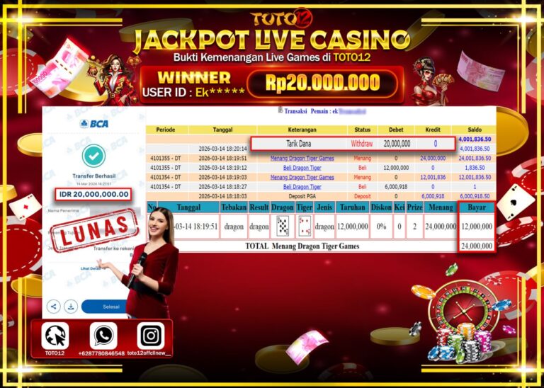 Selamat kepada Member Kami Ek**** Telah Jackpot dan berhasil mendapatkan kemenangan besar pada permainan JACKPOT LIVE GAMES CASINO (DRAGON TIGER) Dengan Kemenangan Sebesar Rp.20.000.000–. Setelah mengisi Fomulir Withdraw dengan Kurang waktu 1-2 Menit Dana sudah kami Trasnfer kepada Pemilik Userid dan dana sudah dapat di cairkan oleh pemenang. Bukti Pembayaran yang TOTO12 berikan merupakan Bukti Pembayaran…