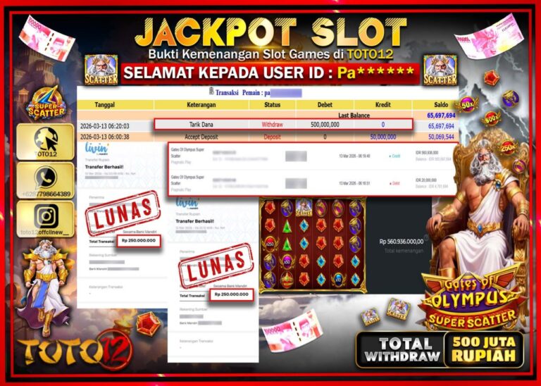 Selamat kepada Member Kami Pa****** Telah Jackpot dan berhasil mendapatkan kemenangan besar pada permainan JACKPOT SLOT GAME (GATES OF OLYMPUS SUPER SCATTER) Dengan Kemenangan Sebesar Rp.500.000.000. Setelah mengisi Fomulir Withdraw dengan Kurang waktu 1-2 Menit Dana sudah kami Trasnfer kepada Pemilik Userid dan dana sudah dapat di cairkan oleh pemenang. Bukti Pembayaran yang TOTO12 berikan merupakan…
