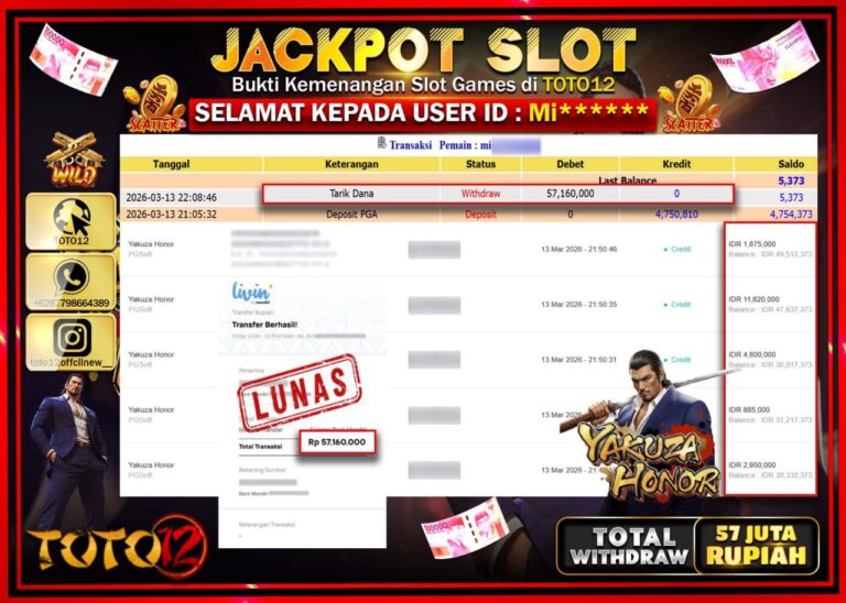 Selamat kepada Member Kami Mi****** Telah Jackpot dan berhasil mendapatkan kemenangan besar pada permainan JACKPOT SLOT GAME (YAKUZA HONOR) Dengan Kemenangan Sebesar Rp.57.160.000. Setelah mengisi Fomulir Withdraw dengan Kurang waktu 1-2 Menit Dana sudah kami Trasnfer kepada Pemilik Userid dan dana sudah dapat di cairkan oleh pemenang. Bukti Pembayaran yang TOTO12 berikan merupakan Bukti Pembayaran yang SAH…