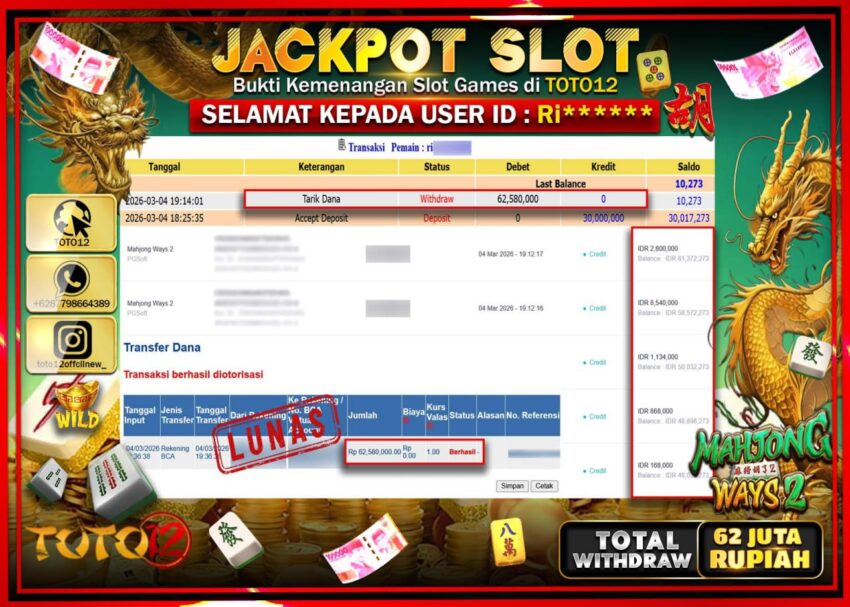 Selamat kepada Member Kami Ri**** Telah Jackpot dan berhasil mendapatkan kemenangan besar pada permainan JACKPOT SLOT GAME  (MAHJONG WAYS 2)  Dengan Kemenangan Sebesar Rp.62.580.000–.