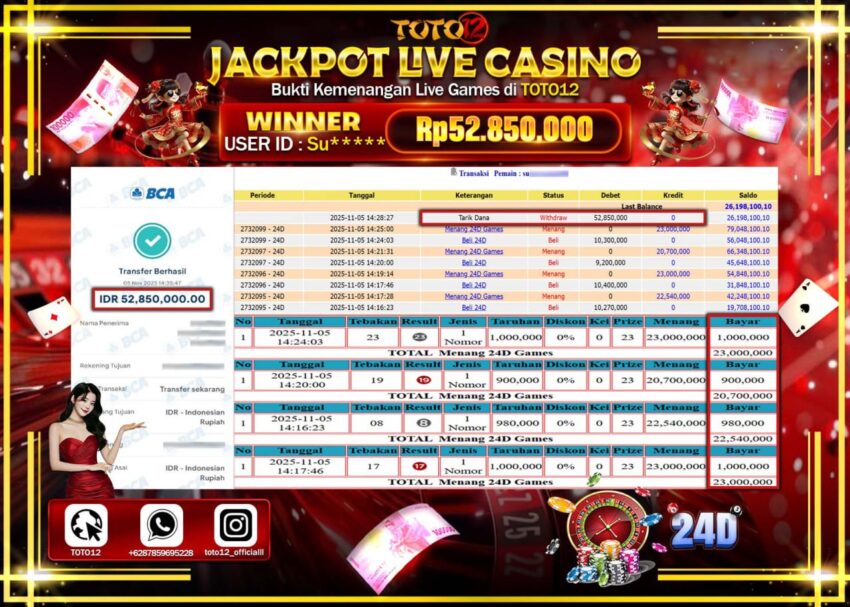 Selamat kepada Member Kami Su****** Telah Jackpot dan berhasil mendapatkan kemenangan besar pada permainan JACKPOT LIVE CASINO (24D GAMES) Dengan Kemenangan Sebesar Rp.52.850.000 –. Setelah mengisi Fomulir Withdraw dengan Kurang waktu 1-2 Menit Dana sudah kami Trasnfer kepada Pemilik Userid dan dana sudah dapat di cairkan oleh pemenang. Bukti Pembayaran yang TOTO12 berikan merupakan Bukti Pembayaran yang SAH / VALID yang langsung Di dapatkan melalui transaksi dari Bank yang di Tunju.