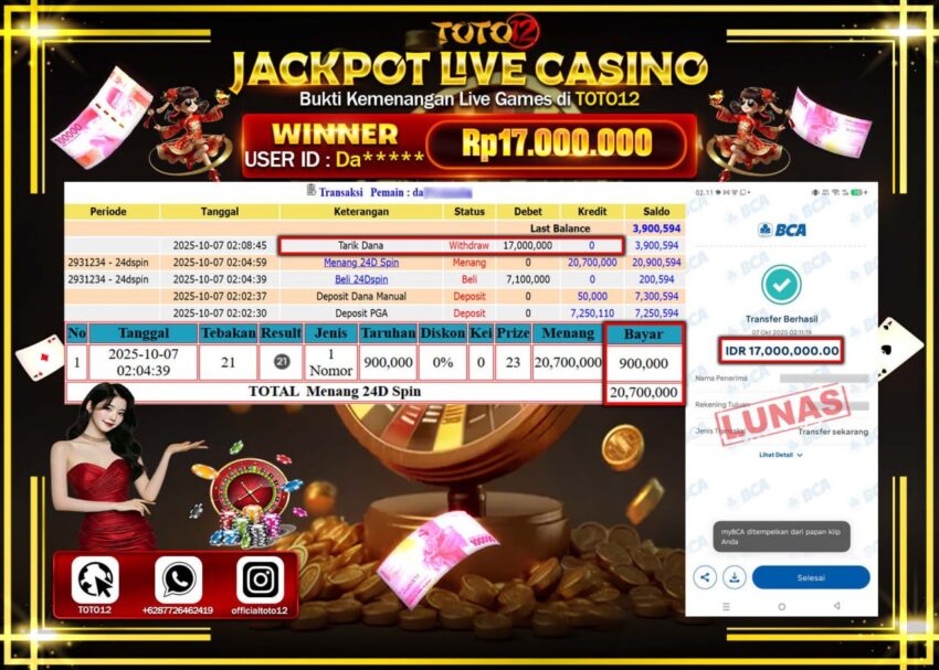 Selamat kepada Member Kami Da****** Telah Jackpot dan berhasil mendapatkan kemenangan besar pada permainan JACKPOT LIVE CASINO (24D SPIN)  Dengan Kemenangan Sebesar Rp.17.000.000 –.  Setelah mengisi Fomulir Withdraw dengan Kurang waktu 1-2 Menit Dana sudah kami Trasnfer kepada Pemilik Userid dan dana sudah dapat di cairkan oleh pemenang. Bukti Pembayaran yang TOTO12 berikan merupakan Bukti Pembayaran yang  SAH / VALID yang langsung Di dapatkan melalui transaksi dari Bank yang di Tunju.