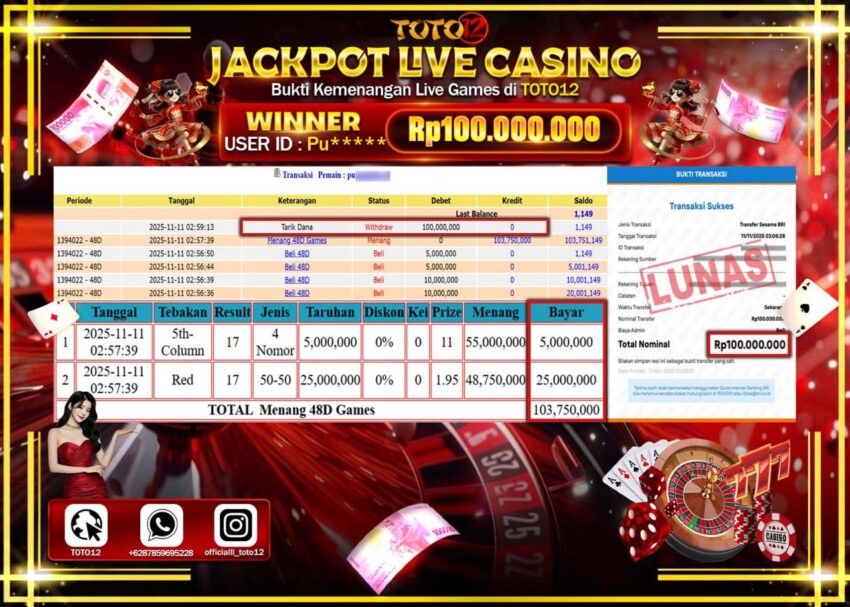 Selamat kepada Member Kami Pu****** Telah Jackpot dan berhasil mendapatkan kemenangan besar pada permainan JACKPOT LIVE CASINO (48D GAMES) Dengan Kemenangan Sebesar Rp.100.000.000 –. Setelah mengisi Fomulir Withdraw dengan Kurang waktu 1-2 Menit Dana sudah kami Trasnfer kepada Pemilik Userid dan dana sudah dapat di cairkan oleh pemenang. Bukti Pembayaran yang TOTO12 berikan merupakan Bukti Pembayaran yang SAH / VALID yang langsung Di dapatkan melalui transaksi dari Bank yang di Tunju.