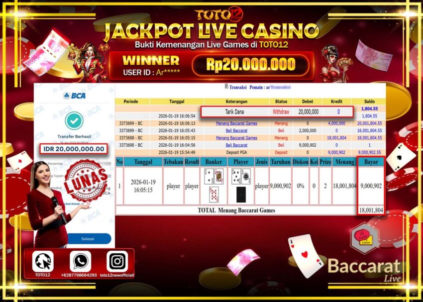 HANYA DI TOTO12 JP PASTI DI BAYAR LUNAS DAN CEPAT!!!!!! JACKPOT LIVE CASINO (BACCARAT GAMES) Rp.20.000.000 !!!!