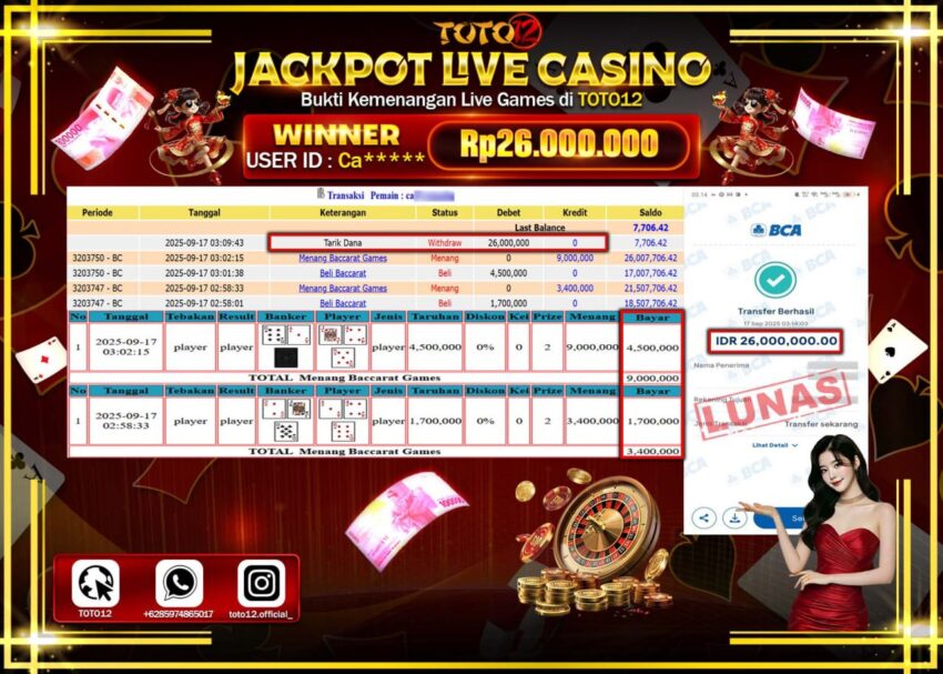 Selamat kepada Member Kami Ca****** Telah Jackpot dan berhasil mendapatkan kemenangan besar pada permainan JACKPOT LIVE CASINO (BACCARAT) Dengan Kemenangan Sebesar Rp.26.000.000 –. Setelah mengisi Fomulir Withdraw dengan Kurang waktu 1-2 Menit Dana sudah kami Trasnfer kepada Pemilik Userid dan dana sudah dapat di cairkan oleh pemenang. Bukti Pembayaran yang TOTO12 berikan merupakan Bukti Pembayaran yang SAH / VALID yang langsung Di dapatkan melalui transaksi dari Bank yang di Tunju.