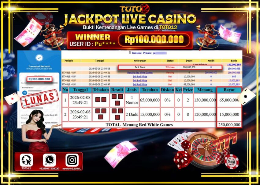 HANYA DI TOTO12 JP PASTI DI BAYAR LUNAS DAN CEPAT!!!!!! JACKPOT LIVE CASINO (RED WHITE) Rp.100.000.000!!!!