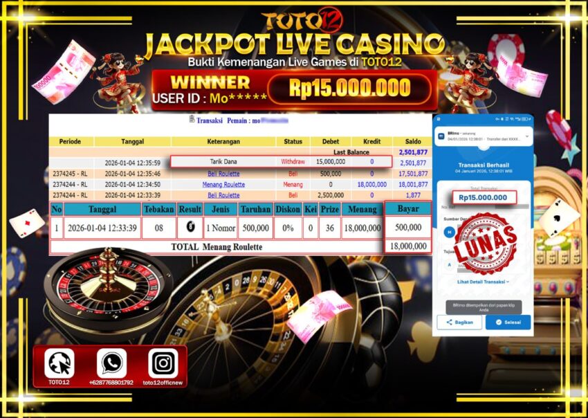HANYA DI TOTO12 JP PASTI DI BAYAR LUNAS DAN CEPAT!!!!!! JACKPOT LIVE CASINO (ROULETTE) Rp.15.000.000 !!!!