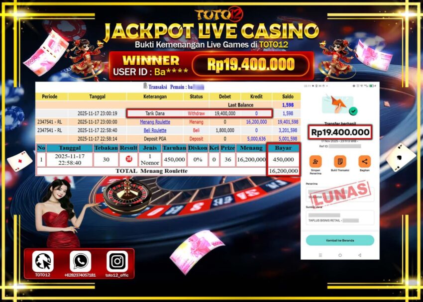 Selamat kepada Member Kami Ba****** Telah Jackpot dan berhasil mendapatkan kemenangan besar pada permainan JACKPOT LIVE CASINO (ROULETTE) Dengan Kemenangan Sebesar Rp.19.400.000 –. Setelah mengisi Fomulir Withdraw dengan Kurang waktu 1-2 Menit Dana sudah kami Trasnfer kepada Pemilik Userid dan dana sudah dapat di cairkan oleh pemenang. Bukti Pembayaran yang TOTO12 berikan merupakan Bukti Pembayaran yang SAH / VALID yang langsung Di dapatkan melalui transaksi dari Bank yang di Tunju.