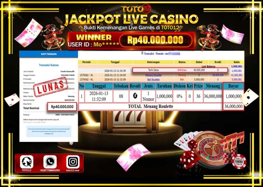 Selamat kepada Member Kami Mo****** Telah Jackpot dan berhasil mendapatkan kemenangan besar pada permainan JACKPOT LIVE CASINO (ROULETTE) Dengan Kemenangan Sebesar Rp.40.000.000 –.